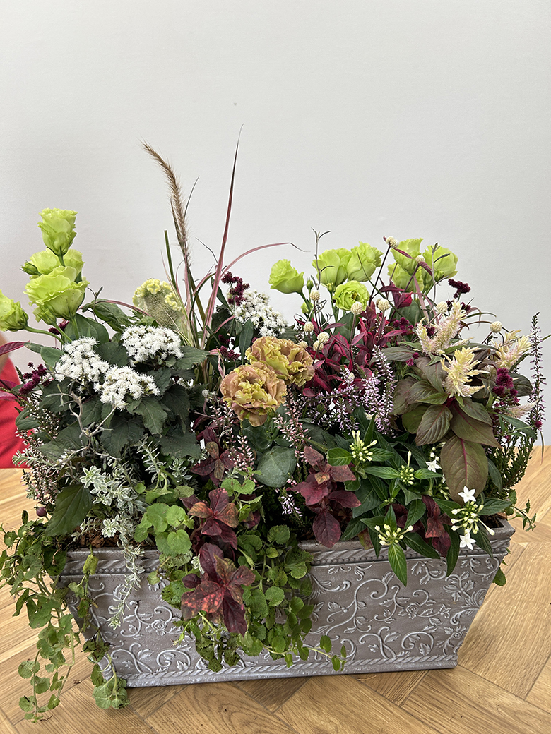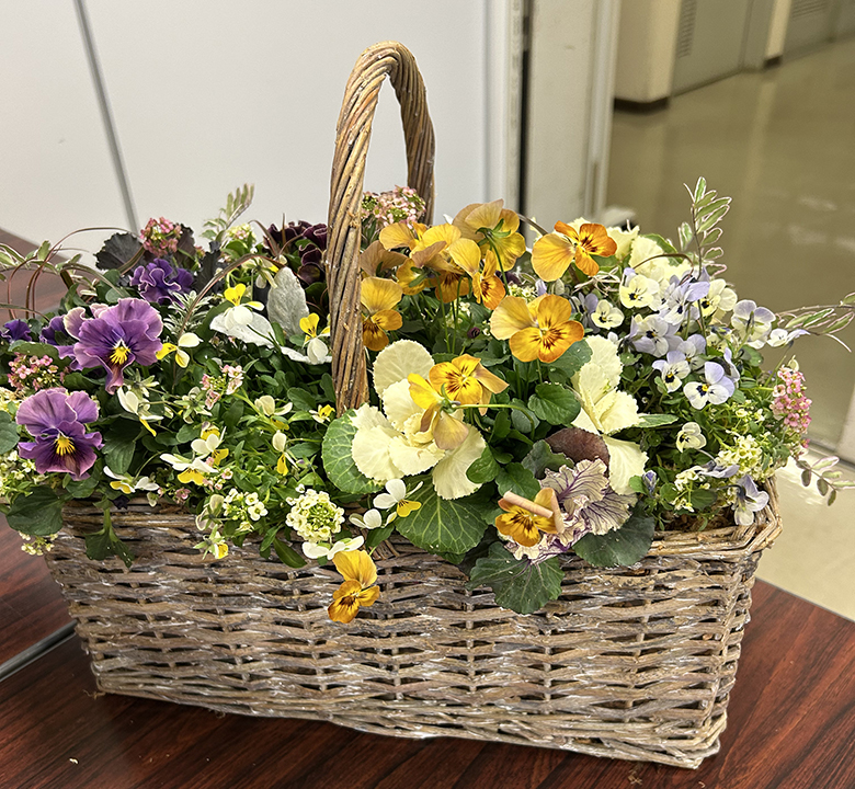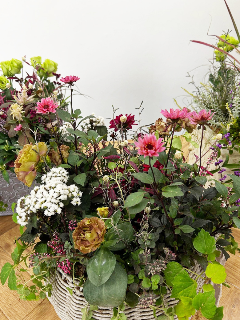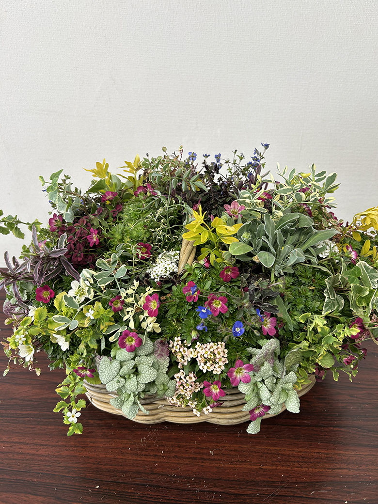 ギャザリングとは、複数の花苗をひとつの器に寄せ集め、まるでひとつの大きな花束のように仕立てるアレンジメント技法です。立体感と華やかさがあり、完成度の高い仕上がりを楽しめます。