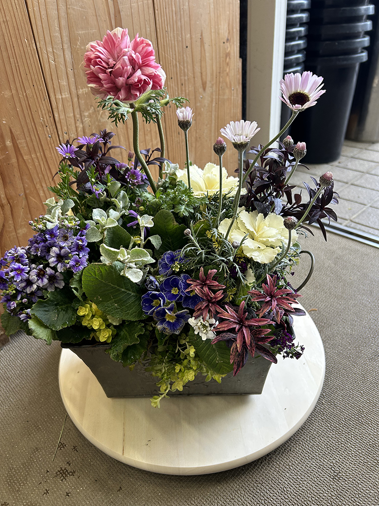ギャザリングとは、複数の花苗をひとつの器に寄せ集め、まるでひとつの大きな花束のように仕立てるアレンジメント技法です。立体感と華やかさがあり、完成度の高い仕上がりを楽しめます。